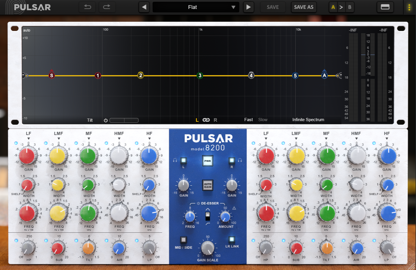 앞선 사진을 보면 알 수 있듯이 이 플러그인은 아날로그 장비를 복각한 플러그인이다. 업계에서는 이미 수십년 간 표준 EQ로 평가받았던 GML사의 8200 모델을 복각하였는데, 기존 8200은 LR 스테레오 신호를 받아 각 신호별로 5개의 구간으로 제어, 총 10줄의 노브를 통해 사운드를 제어하였다. 하지만 그렇게만 복각했다면 이 친구는 현대에서는 그저 선대 전설의 장비를 따라 했다, 그 이상의 의미를 가지긴 어려웠을 것이다. 이 플러그인은 현대에 발맞추어 엄청난 편의성과 강력한 기능을 추가로 탑재하여 다시 돌아왔다. 기능들을 차근차근 살펴보는 것으로 시작해 보자.